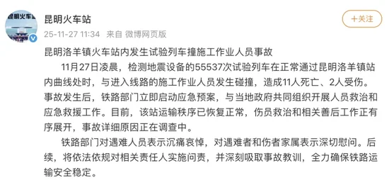 来源:潇湘晨报 11月27日昆明火车站通报昆明洛羊镇火车站内发生试验列车撞施工作业人员事故: 11月27日凌晨...