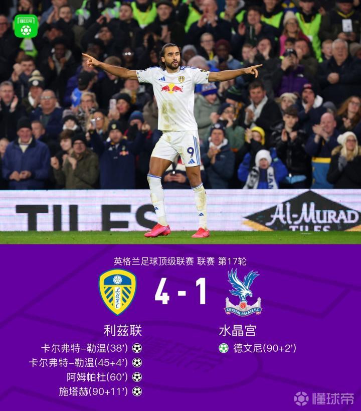 英超第17轮比赛中,利兹联主场以4-1大胜水晶宫。卡尔弗特-勒温上半场梅开二度,比约尔两次助攻,阿姆帕杜和施塔赫分别进球扩大战果。水晶宫的德文尼通过点球扳回一分。最终利兹联全场掌控,取得一场大胜。...