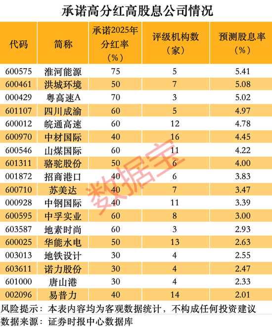 据证券时报·数据宝梳理,剔除2025年中期实施了分红的公司后,有超过50家公司承诺2025年分红率不低于30%且评级机构数在3家以上。