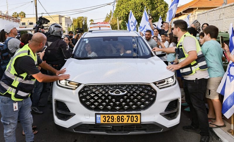 当地时间10月16日,以色列获释人质及其家属乘坐中国产汽车回家。《以色列时报》