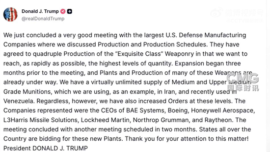 据央视此前报道,特朗普曾表示,美国弹药库存几乎无穷无尽,急召军工巨头赴白宫开会。