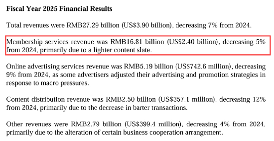 更令人担忧的是会员服务的下滑。财报显示,2025年会员服务收入为168.1亿元,同比下滑5%。作为第二大板块,在线广告服务同样面临压力,2025年营收为51.9亿元,同比下滑9%。