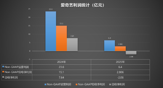 忧的一面是,自2023年《狂飙》创下现象级热度后,爱奇艺已连续2年营收下滑,2025年同比减少7%。受到营收下滑的拖累,尽管爱奇艺连续4年实现Non-GAAP(非美国通用会计准则)运营盈利,但2025年该利润额同比缩水70%,归属于爱奇艺的净利润则由盈转亏。