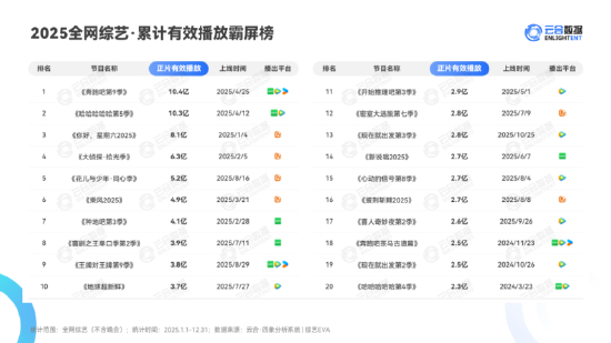 喜的一面则是,爱奇艺在剧集赛道依旧保持领先地位。根据云合数据,2025年爱奇艺剧集总有效播放市占率位居第一。但《种地吧3》《喜剧之王单口季2》等头部“综N代”节目播放量出现明显下滑。