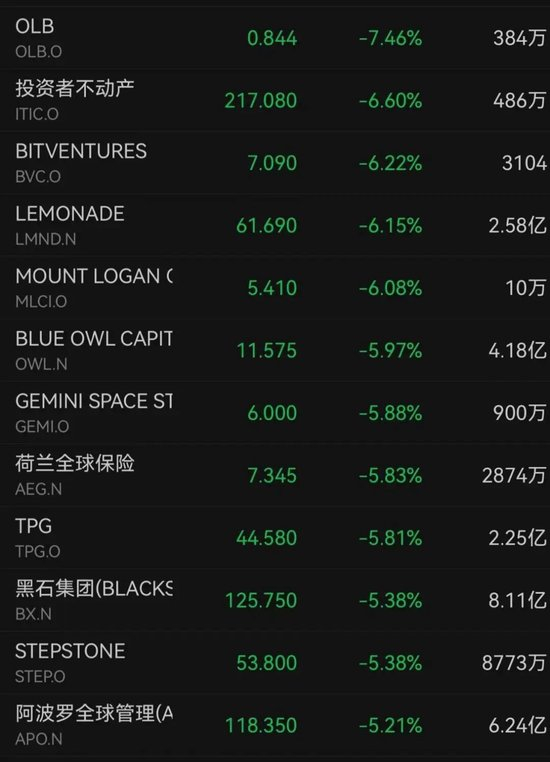 资产管理公司集体承压。Blue Owl Capital下跌近6%,荷兰全球保险、黑石集团、阿波罗全球管理分别下跌5.83%、5.38%、5.21%。