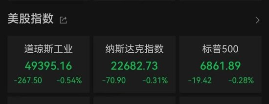 截至收盘,道琼斯指数下跌0.54%,报49395.16点;标普500指数下跌0.28%,报6861.89点;纳斯达克综合指数下跌0.31%,报22682.73点。