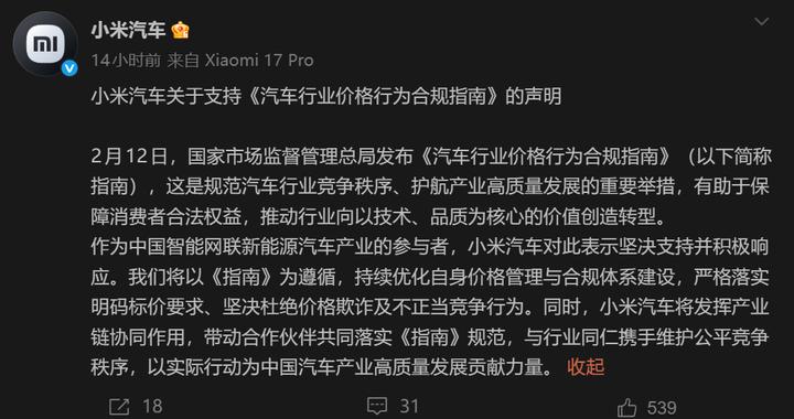 2月12日,小米汽车官微发布关于支持《汽车行业价格行为合规指南》的声明: