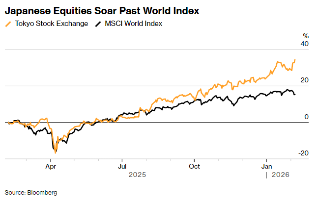 受市场对高市早苗扩大财政支出、拉动经济增长的预期支撑,日本东证指数上周五收于历史新高,今年以来涨幅已超8%;而同期全球发达市场股票指数的涨幅仅勉强达到2%左右。