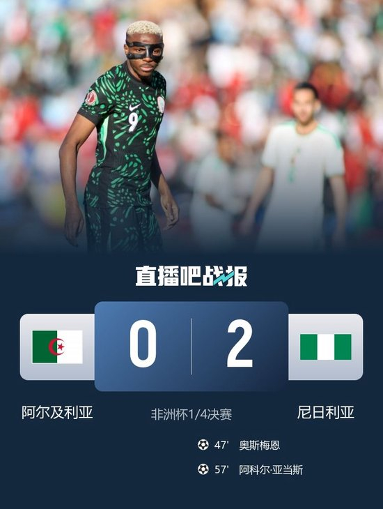 直播吧1月11日讯 北京时间1月11日0点,非洲杯四分之一决赛,阿尔及利亚对阵尼日利亚。上半场,本塞拜尼完成门线救险。下半场,奥斯梅恩头球破门,亚当斯扩大比分,随后他头球中柱。最终尼日利亚2-0击败阿尔及利亚。尼日利亚在半决赛中将对阵摩洛哥。