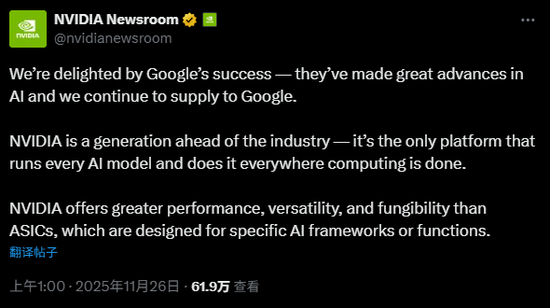 英伟达在社交平台X上发文称:“我们对谷歌的成功感到高兴——他们在人工智能方面取得了巨大进展,而我们也将继续向谷歌供货。”