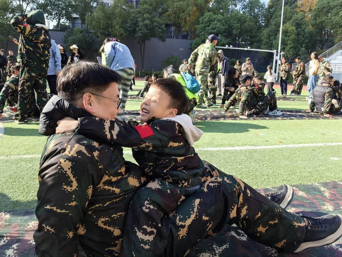 近日,武汉市武昌区沙湖幼儿园里一片“军绿色”——全体孩子和家长身穿迷彩服,变身“大小兵”,在冬日暖阳中开启了一场别开生面的亲子运动会。