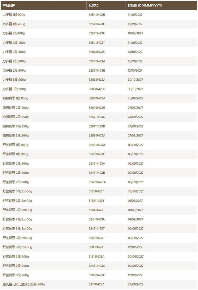 雀巢中国官网发布的“预防性自愿回收婴幼儿配方奶粉”公告披露了需要召回的产品批次,涉及力多精、铂初能恩、舒宜能恩、惠氏等多批次产品。公告称,自愿回收所有此次涉事的进口自欧洲、在中国大陆跨境电商渠道销售的婴幼儿配方奶粉。本次回收范围之外的所有其他雀巢产品及同类产品的其他批次均可安全食用。