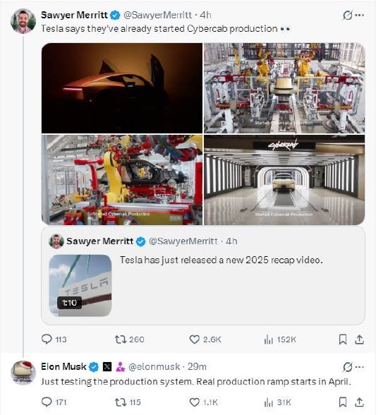 电动汽车分析师索耶·梅瑞特在X上发帖称,特斯拉表示他们已经开始生产Cybercab(无人驾驶出租车)。