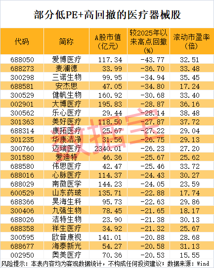 上述这45只医疗器械股中,11月24日收盘价与年内高点相比,23股回撤幅度超20%。其中5股回撤幅度逾30%,分别为爱博医疗、麦澜德、三诺生物、安杰思、健帆生物。