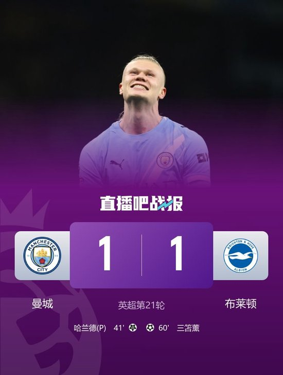 直播吧1月8日讯 北京时间1月8日凌晨3时30分,英超第21轮,曼城坐镇伊蒂哈德球场迎战布莱顿。上半场,多库造点,哈兰德点射首开记录。曼城半场1-0领先布莱顿。下半场,三笘薰扳平比分,B席有一脚射门击中立柱。最终曼城1-1战平布莱顿,联赛遭遇三连平,曼城先赛情况下暂落后榜首5分。