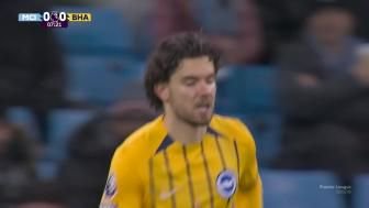 第4分钟,布莱顿前场左路高空球斜传到禁区内,格罗斯后点头球攻门,球被多纳鲁马扑出,随后格罗斯补射,被多纳鲁马没收!