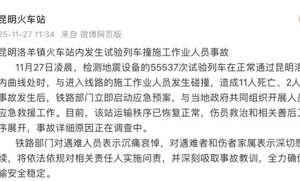 来源:潇湘晨报 11月27日昆明火车站通报昆明洛羊镇火车站内发生试验列车撞施工作业人员事故: 11月27日凌晨...