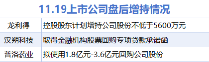 据统计,11月19日,盘后龙利得、汉朔科技、普洛药业披露增持情况。包括速达股份、湖南白银、紫光股份、中水渔业、...
