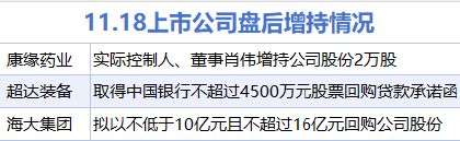 据统计,11月18日,盘后康缘药业、超达装备、海大集团披露增持情况。包括立达信、艾布鲁、高德红外、嘉美包装、蕾...